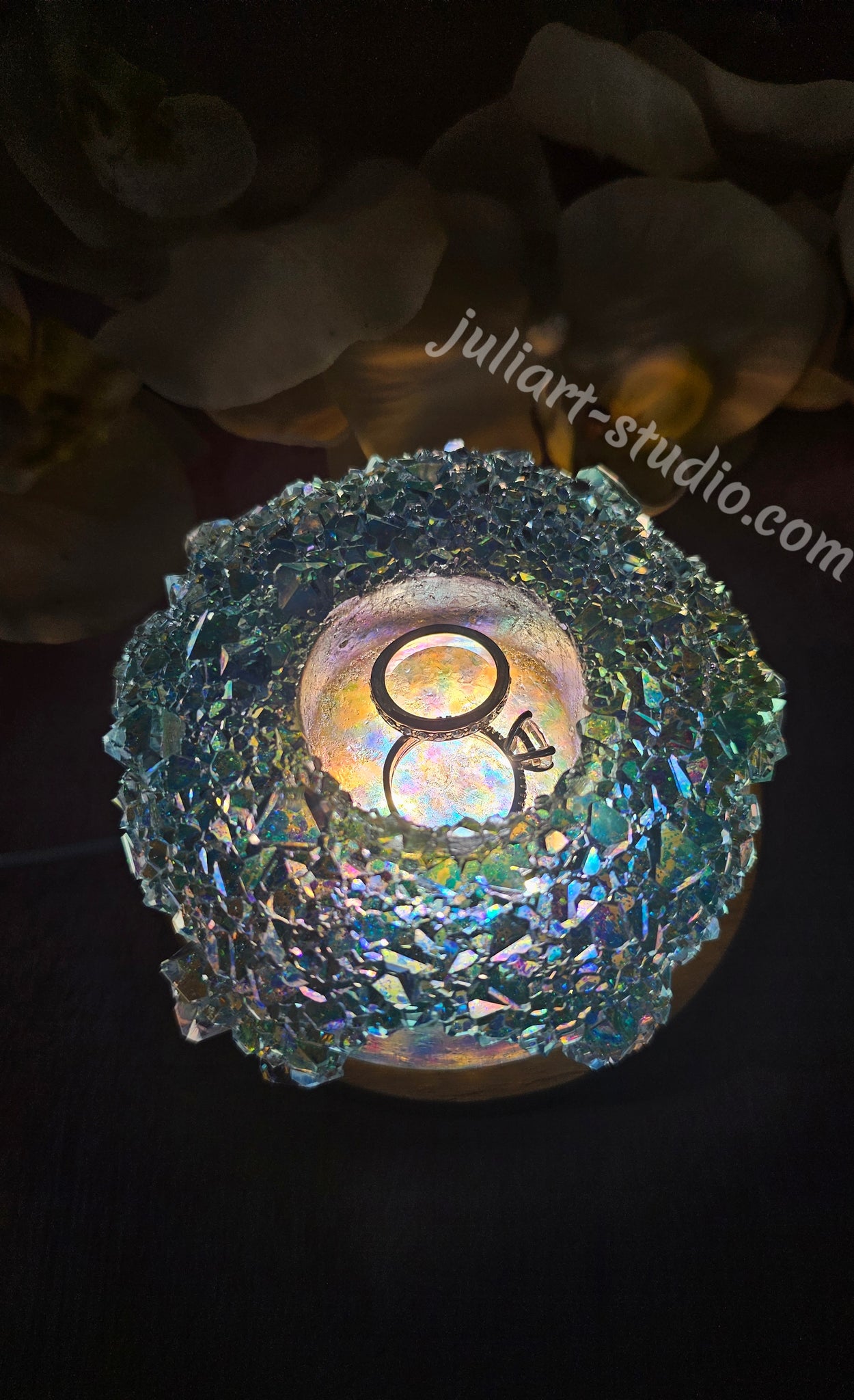 ONE 4.2 inch Irredescent Resin Crystal Tealight Holder in Saphire color (as picture examples). This resin item comes with a USB wooden LED Light Base and a battery-operated LED Tealight. This can also be used as a ring holder.