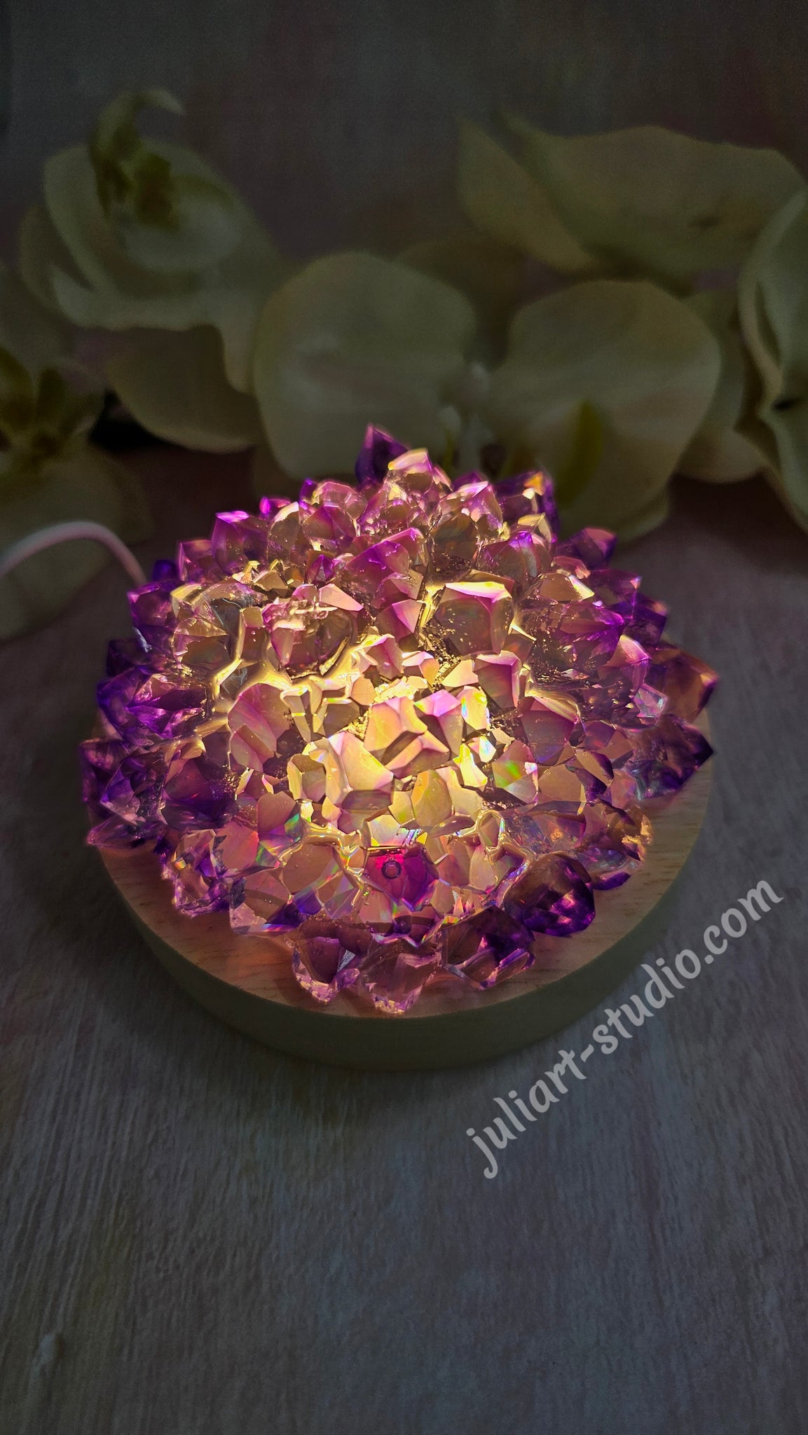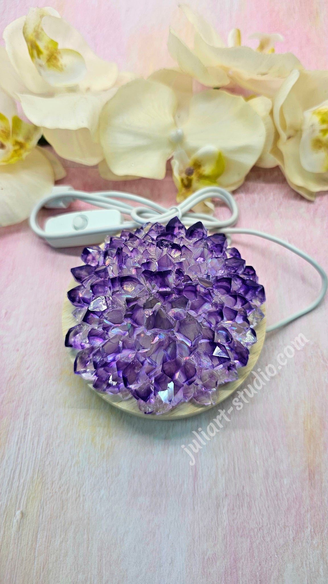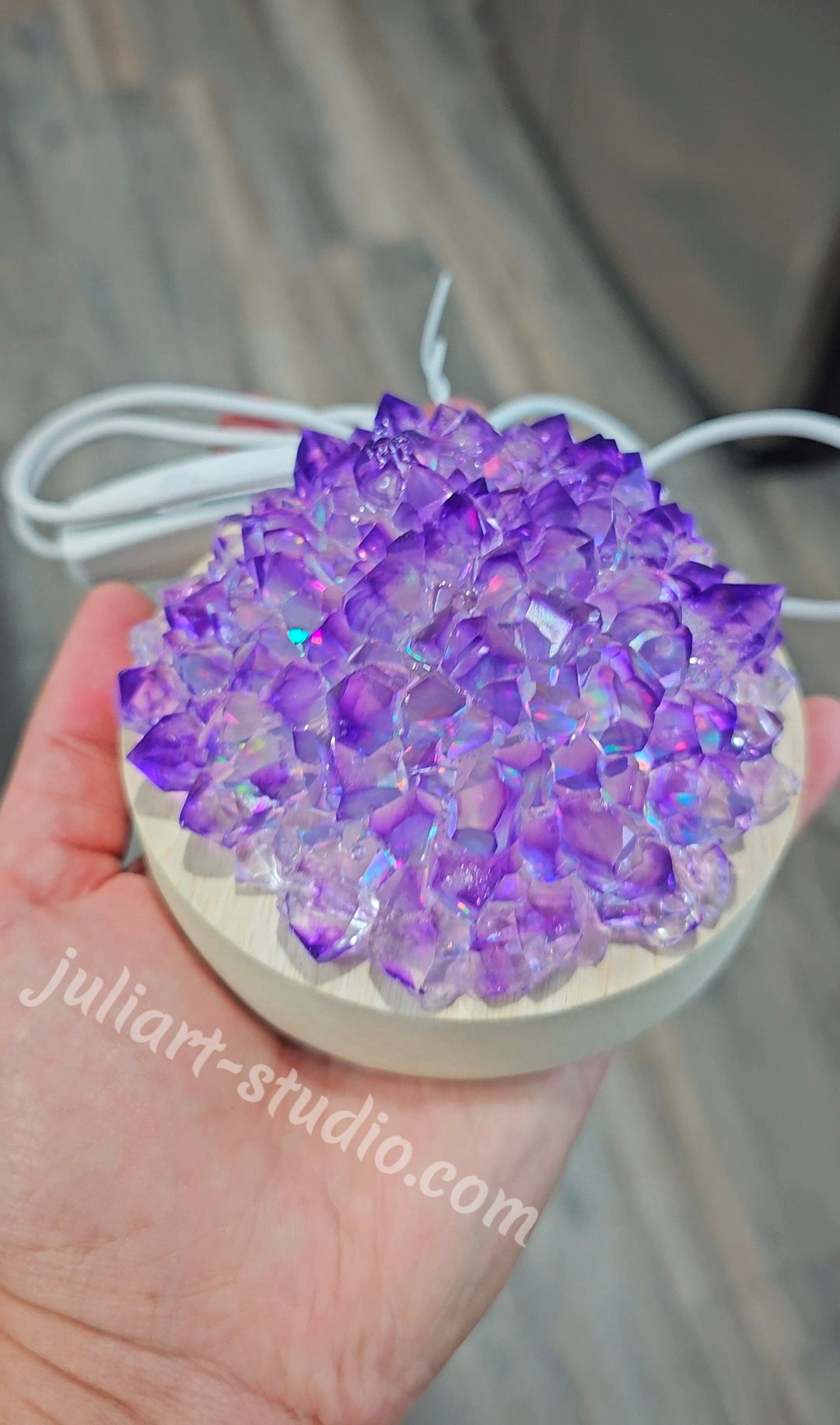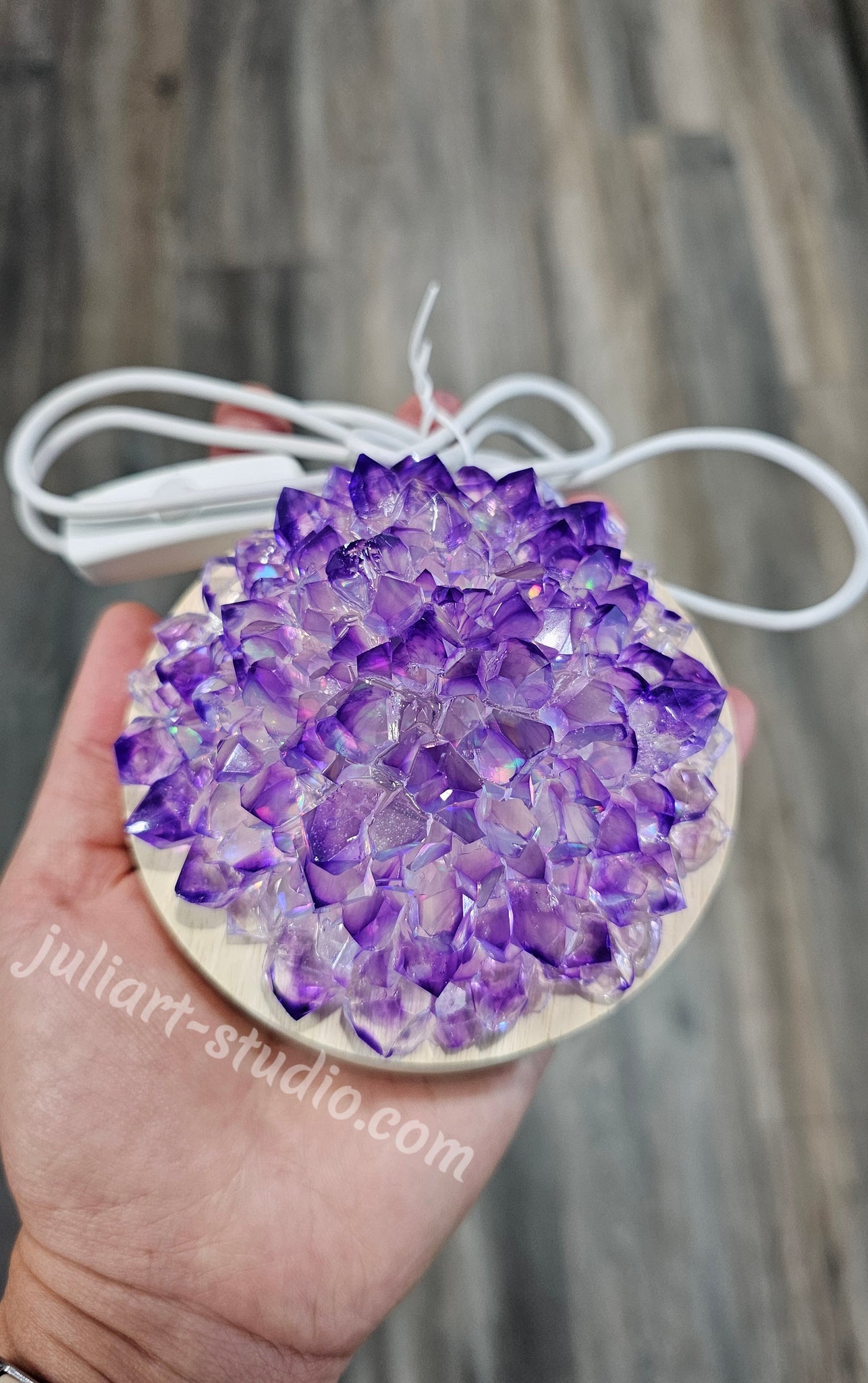 ONE 4 inch Amethyst Resin Crystal Dahlia LED Light (as picture examples). This resin crystal is attached on a USB wooden base and ready to be used as a LED light.