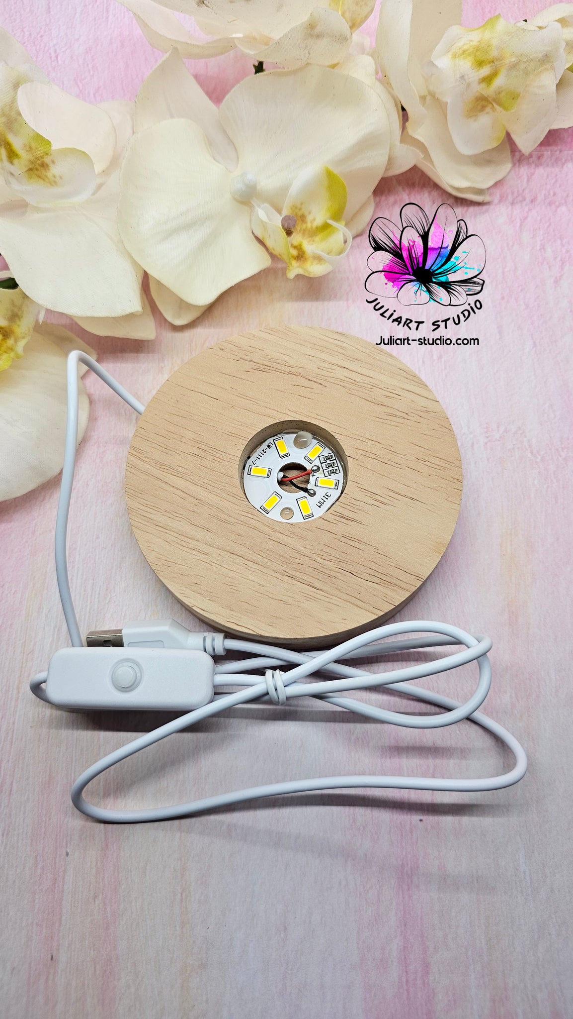 ONE 4 inch Resin Crystal Dahlia in Blue with Holographic background (as picture examples). This resin item comes with a USB wooden LED Light Base.